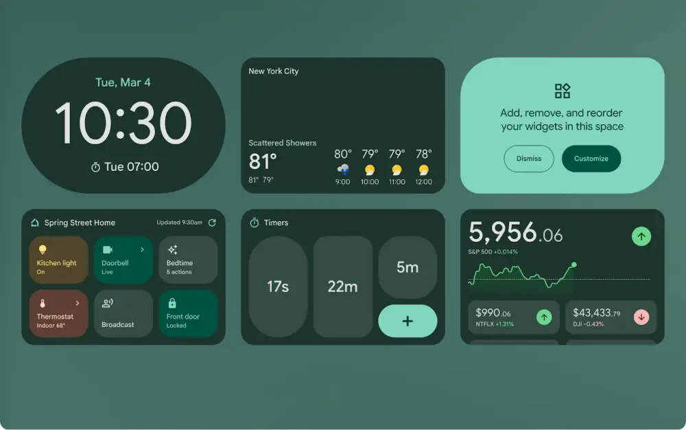 • Android: дає змогу розміщувати віджети в будь-якому місці екрана, вільно змінювати їхній розмір, прозорість та інтерактивність. Багато віджетів дають змогу прокручувати списки (наприклад, список справ) прямо у вікні.